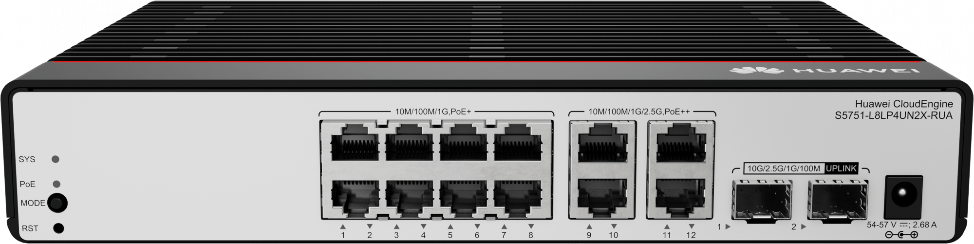 Модель S5751-L8LP4UN2X-RUA оснащена 8 портами 10/100/1000 Base-T с поддержкой PoE и 4 портами 2.5G Base-T PoE, что обеспечивает универсальный доступ для терминалов разного уровня нагрузки. Наличие двух 10GE SFP портов расширяет пропускную способность и делает устройство оптимальным для высокоскоростных подключений в кампусных сетях. Коммутатор функционирует по упрощенной архитектуре Huawei CloudEngine, что снижает сложность внедрения и управления сетью.​