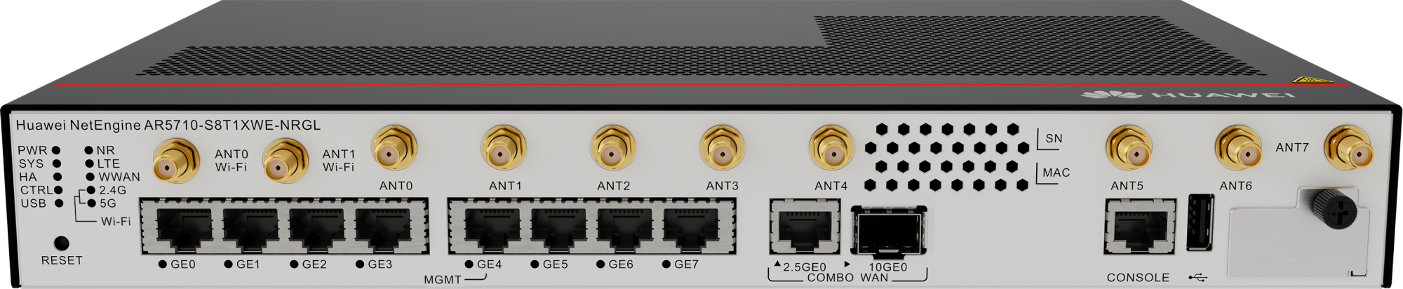 AR5710-S8T1XWE-NRGL — это высокопроизводительное фиксированное устройство из серии NetEngine AR5710-S, предназначенное для обеспечения надежного сетевого доступа в филиалах предприятий. Модель AR5710-S8T1XWE-NRGL сочетает встроенные модули 5G SA/NSA и Wi-Fi 7, предлагая гибкие опции подключения для современных бизнес-сценариев.